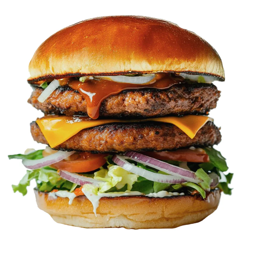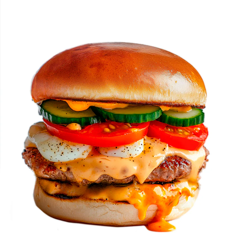 Две котлеты из говядины, сыр Чеддер(в растопленном виде), овощи на мангале с добавлением молодой зелени (петрушка, укроп, зелены лук), айсберг, маринованные огурцы, красный лук, фирменный соус, соус BBQ