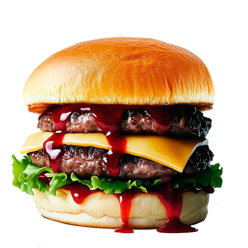 Две котлеты из говядины, сыр моцарелла, помидор, айсберг, кусочки сочной вишни, вишневый соус, сырный соус