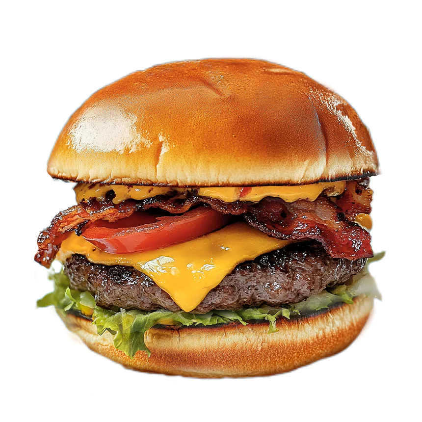 Котлета из говядины со специями, бекон, пряный соус, сыр Чеддер(в растопленном виде), помидор, салат Айсберг в перемешку с пекинской капустой
