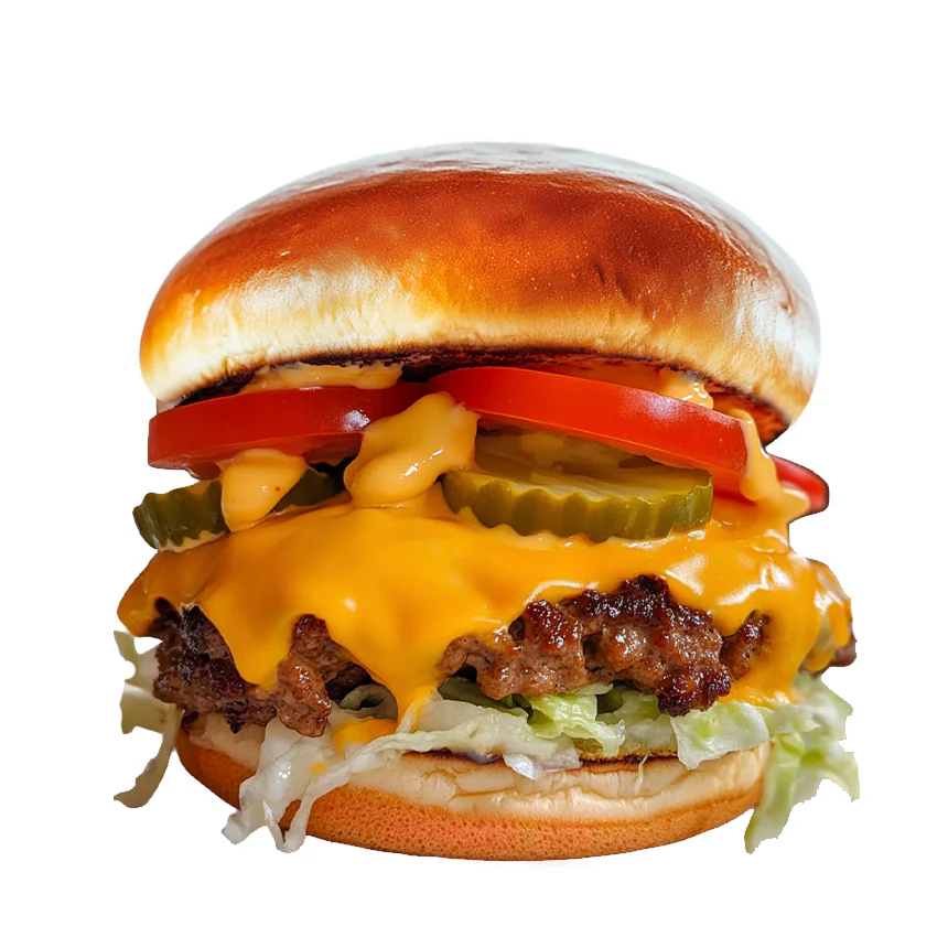 Котлета из говядины, салат айсберг, пекинская капуста, свежие помидоры, маринованные огурцы, сыр Чеддер(в растопленном виде), фирменный соус