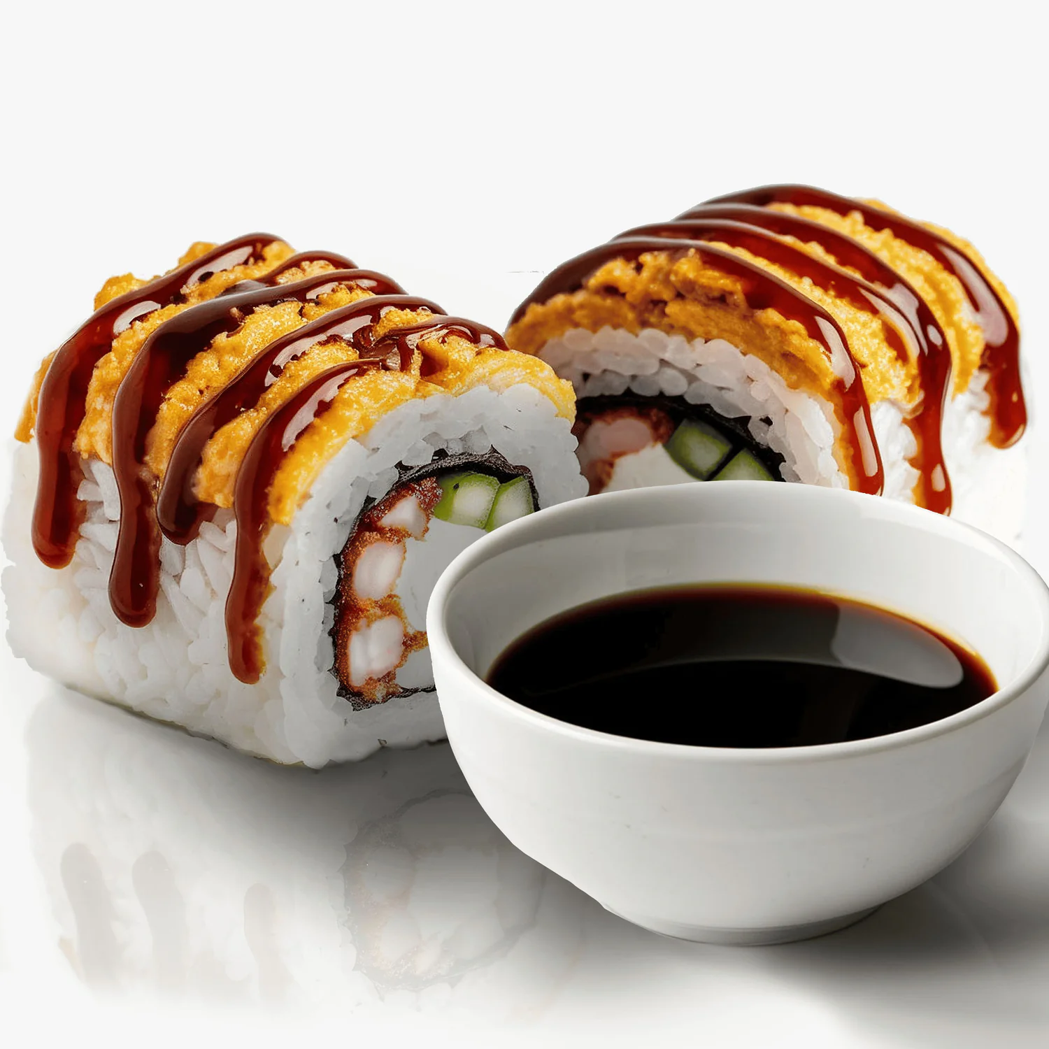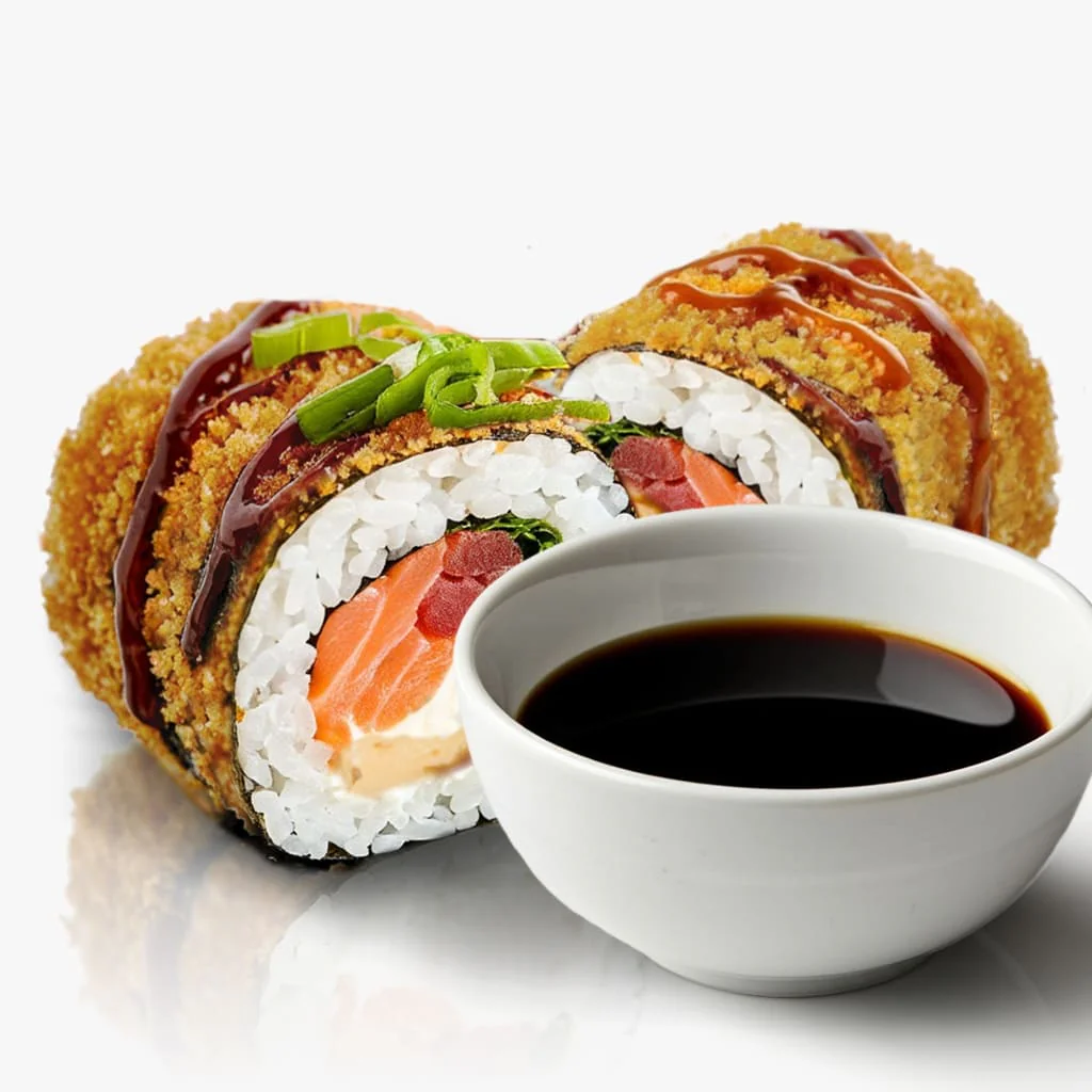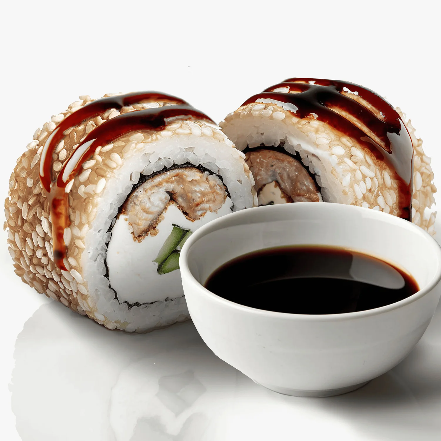 Лосось, грибы шиитаке, сливочный сыр, икра тобико, соус унаги, фирменный соус. Нежный и пикантный вкус данного ролла не оставит равнодушными. Состав указан с учетом составляющих шапочки ролла.
