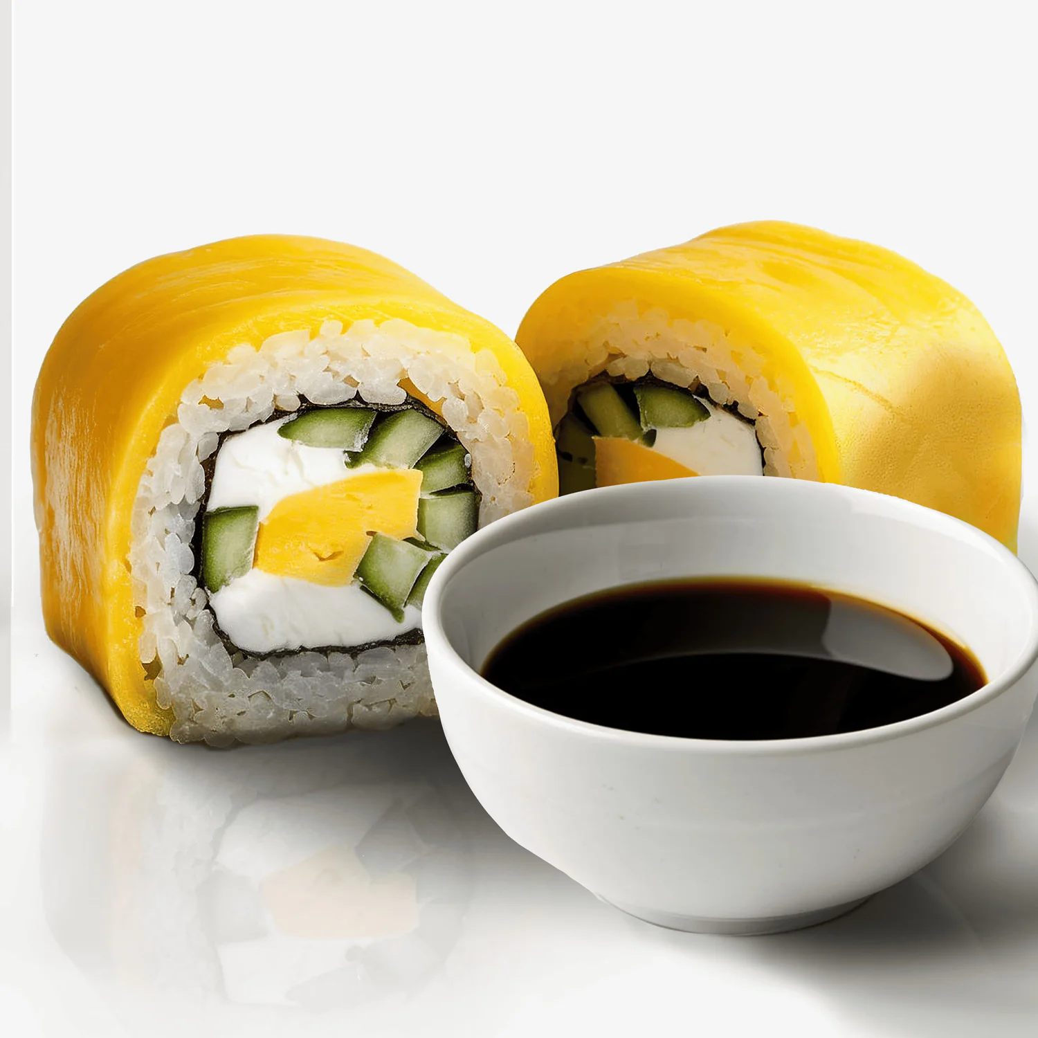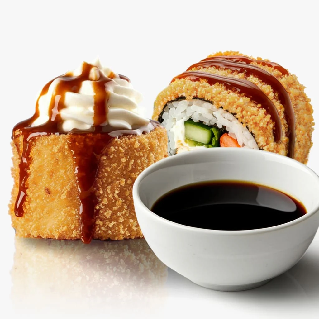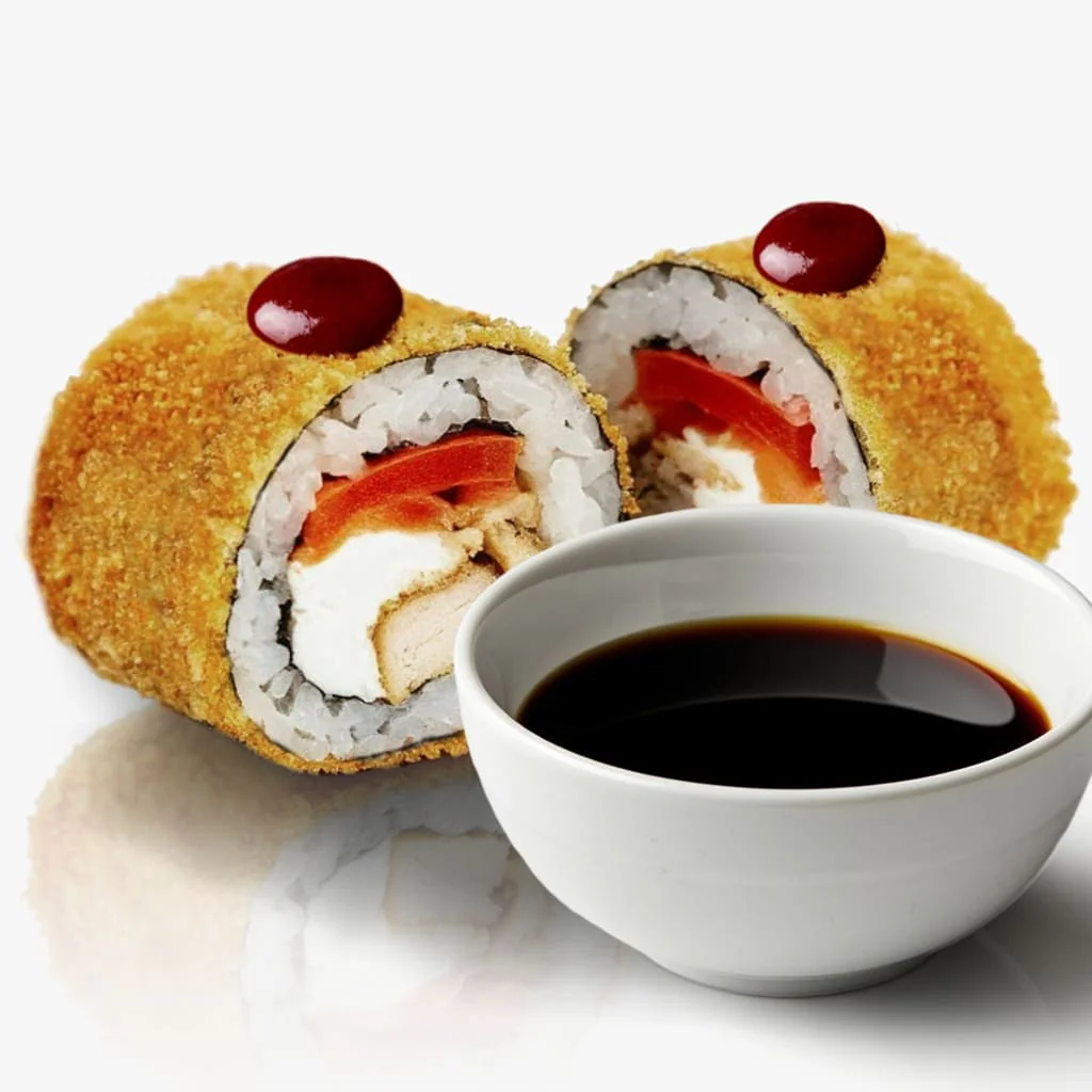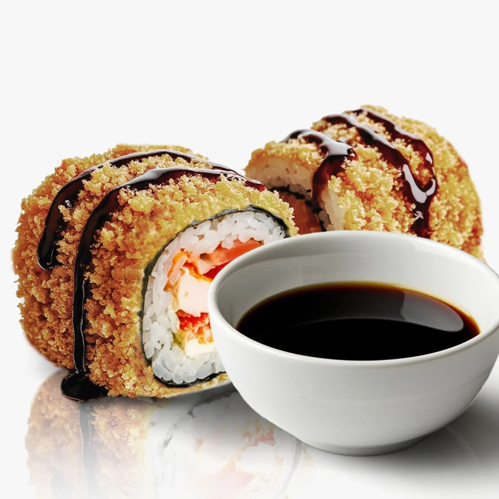 Лосось, грибы шиитаке, сливочный сыр, икра тобико, соус унаги, фирменный соус. Нежный и пикантный вкус данного ролла не оставит равнодушными. Состав указан с учетом составляющих шапочки ролла.