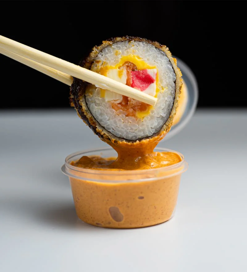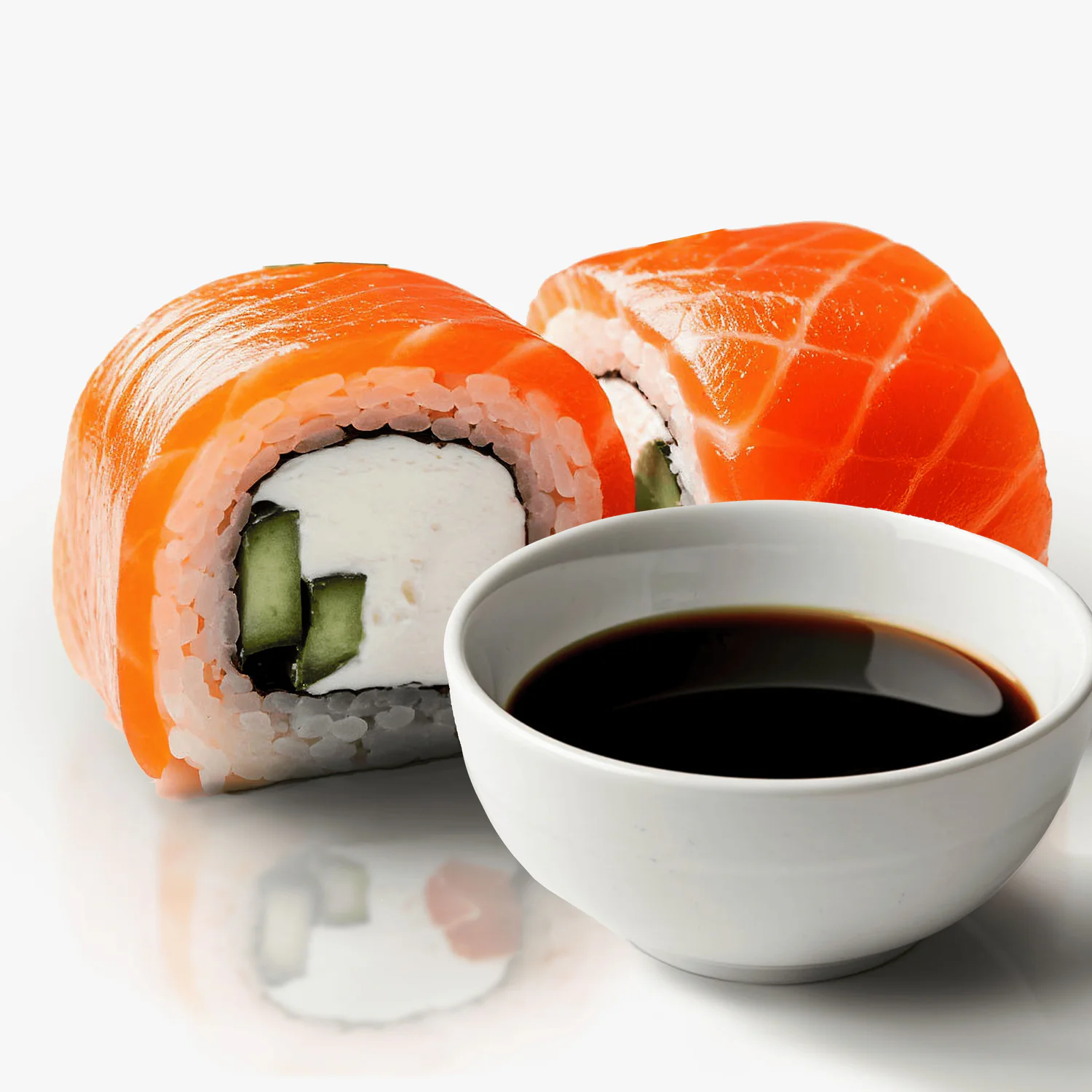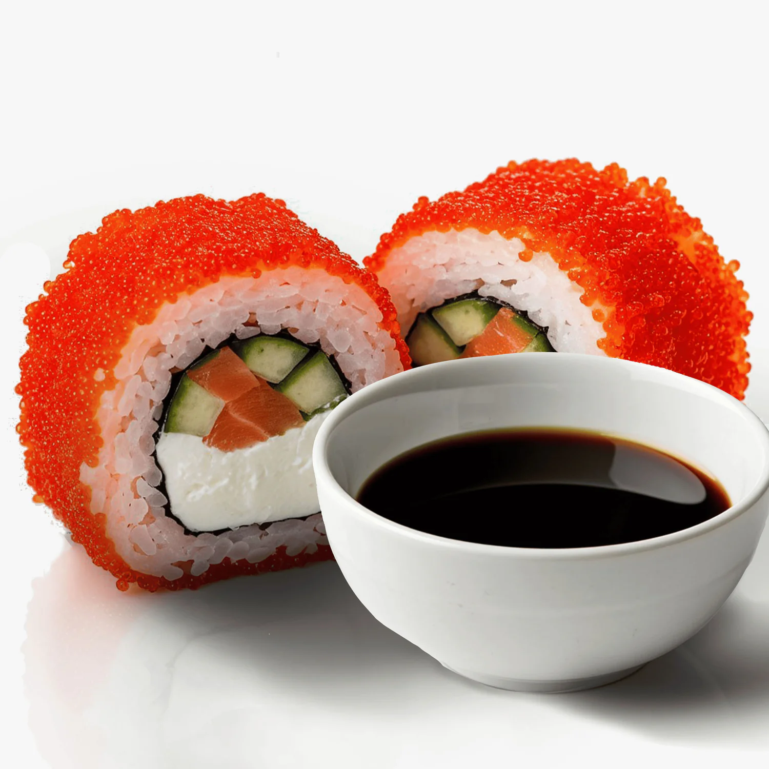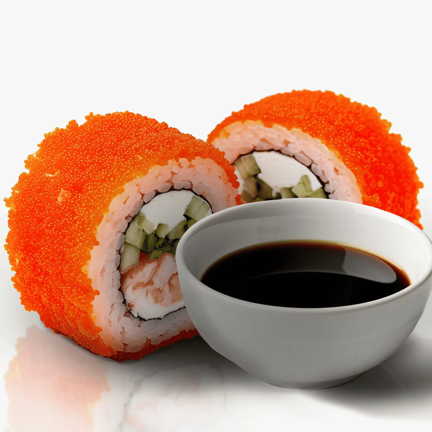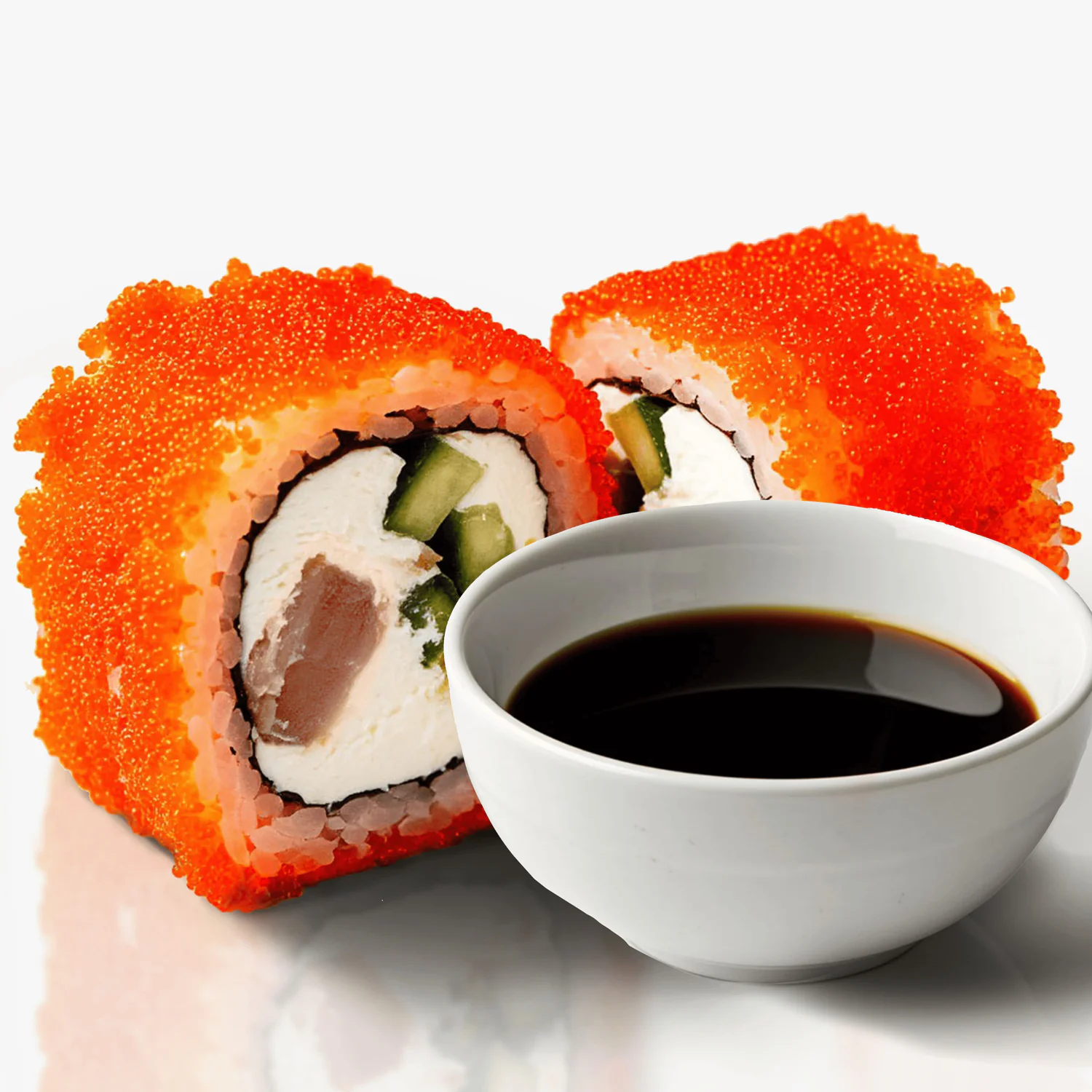 Лосось, тобико, дайкон маринованный, огурец, сливочный сыр, спайси соус