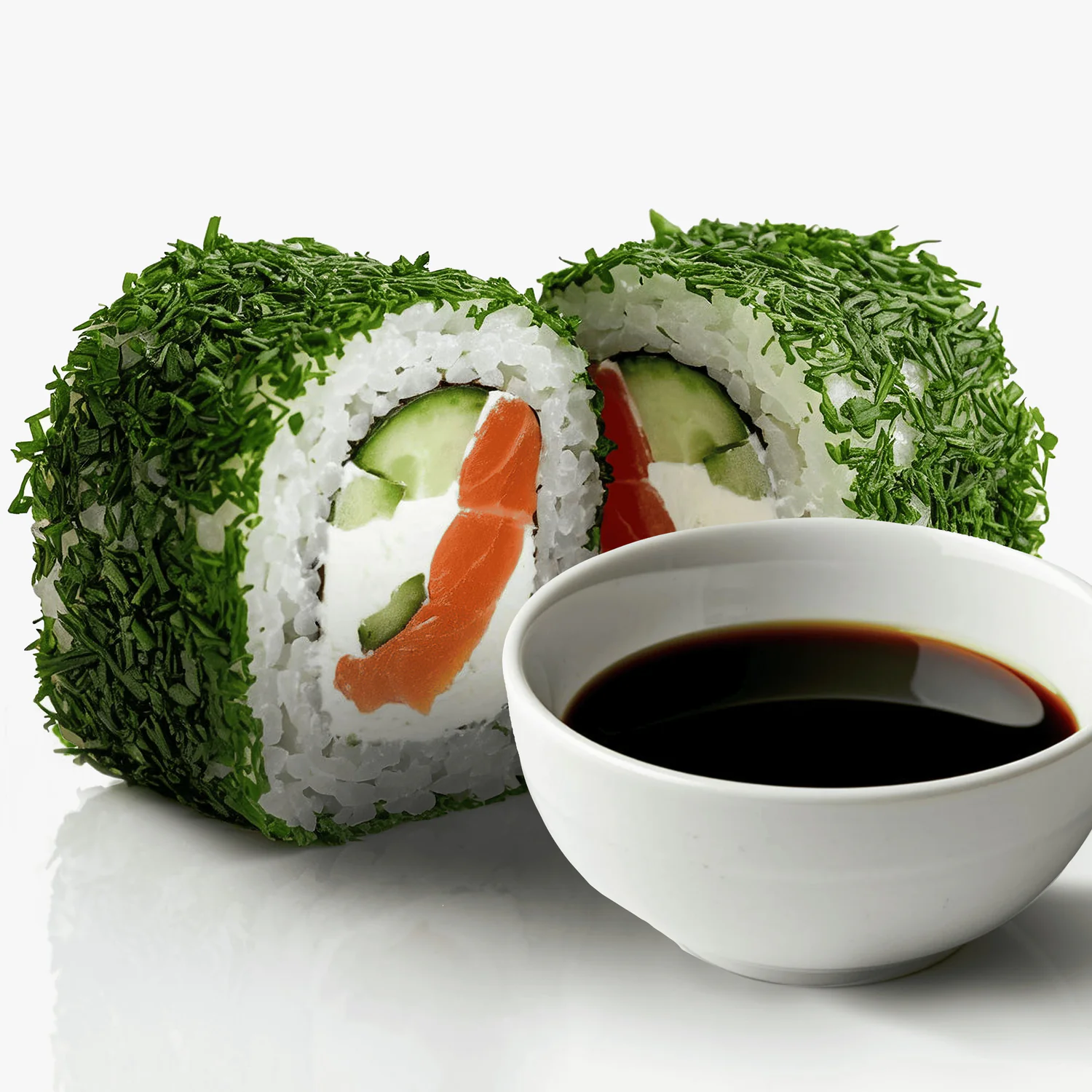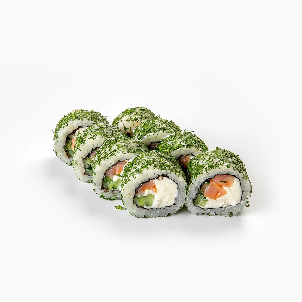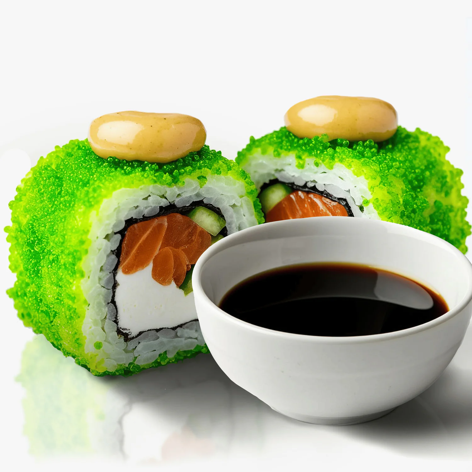 Масаго Зеленая, тонко нарезанный Лосось, Креветка, Майонез, Соус унаги, сыр Чеддер, сыр творожный «Hochland». Состав включает в себя в том числе и шапочку ролла. В ролле присутствует небольшая острота.