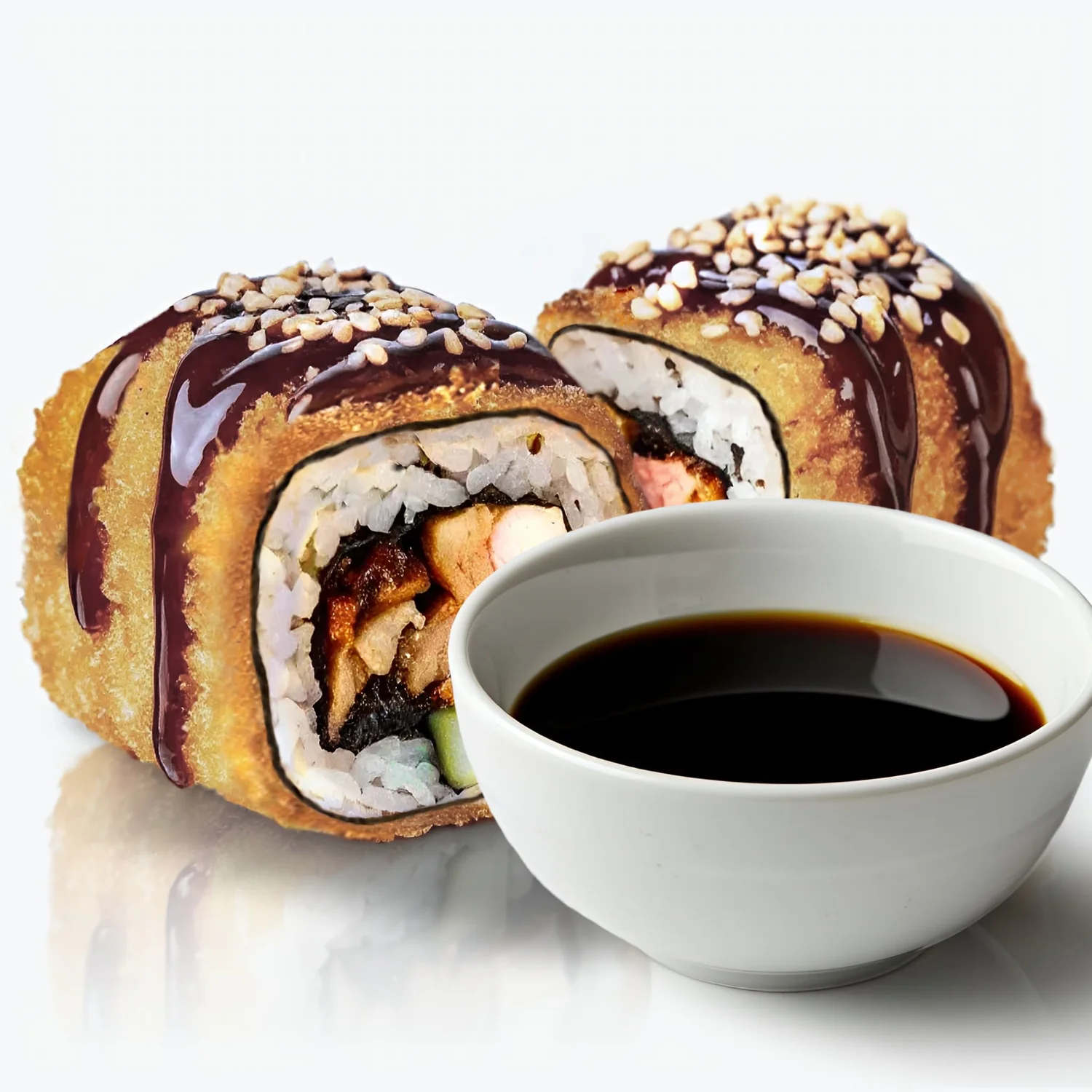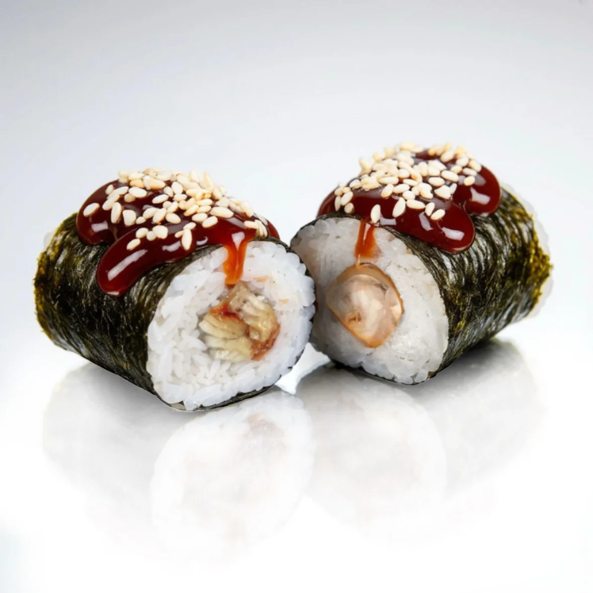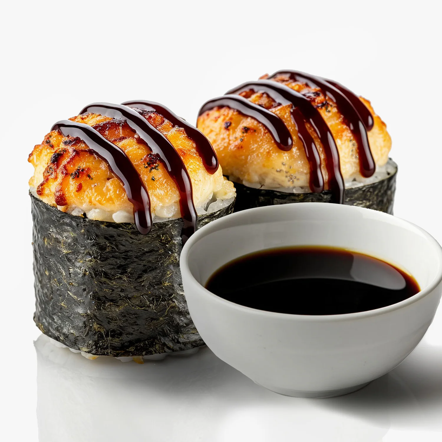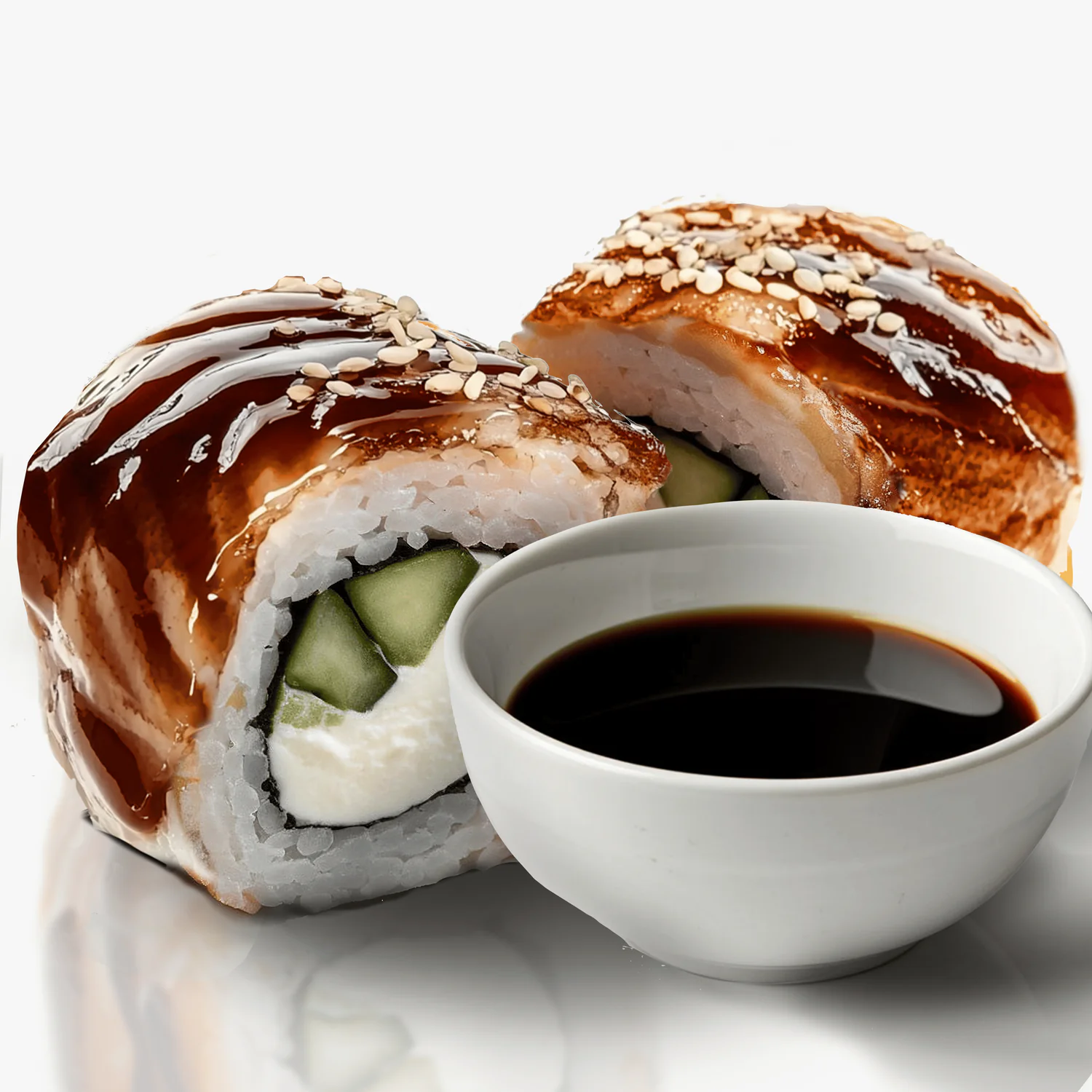 Запеченный ролл. Сыр творожный «Hochland», Масаго Чёрная, тонко нарезанный Лосось, Угорь, Майонез, Соус унаги. Состав включает в себя в том числе и шапочку ролла.
