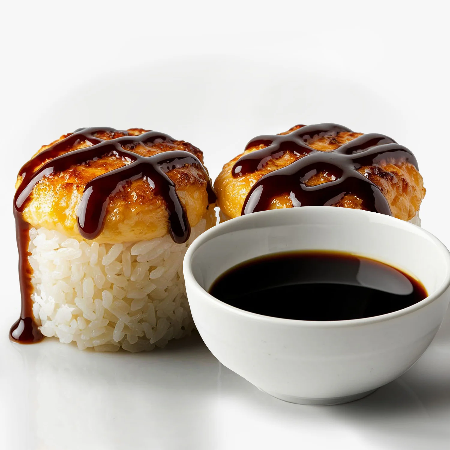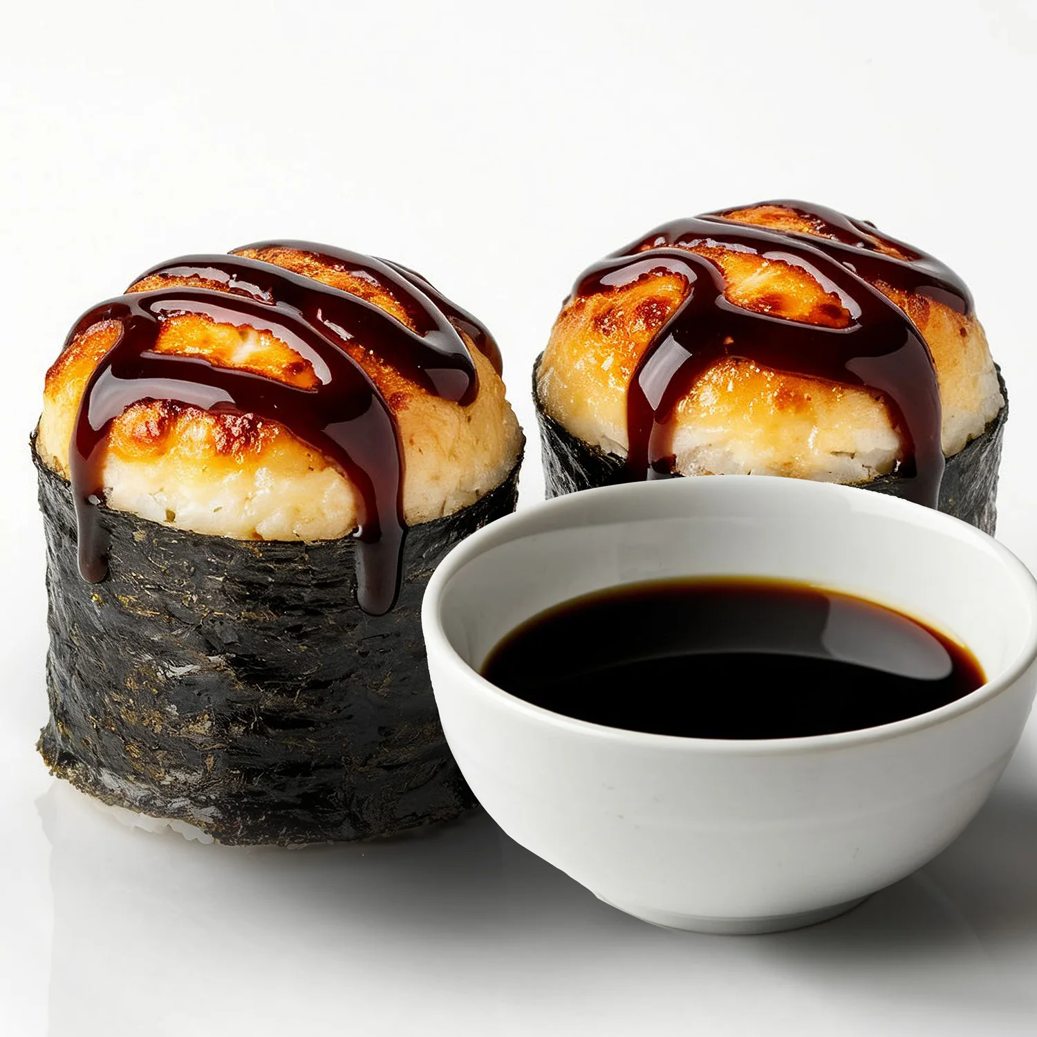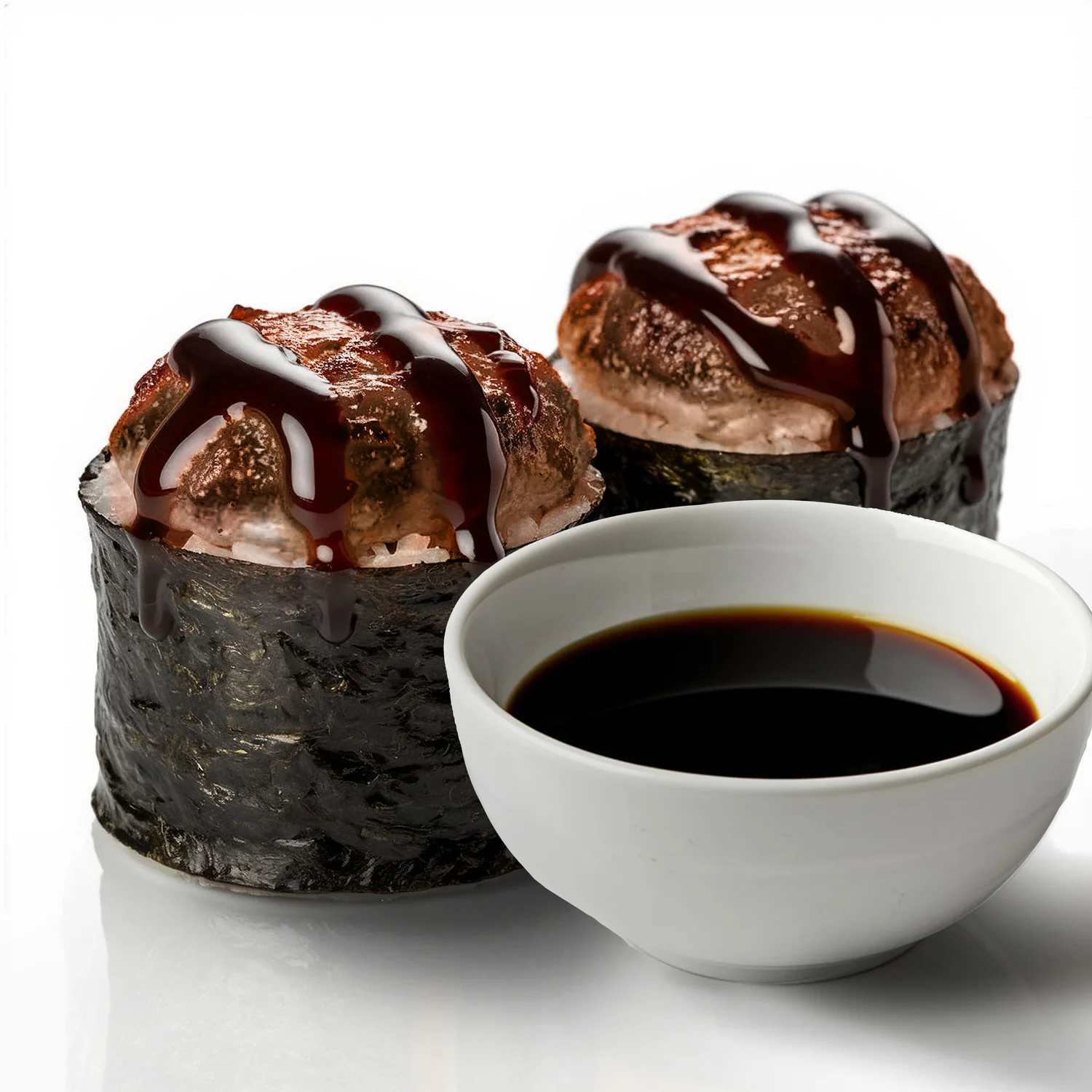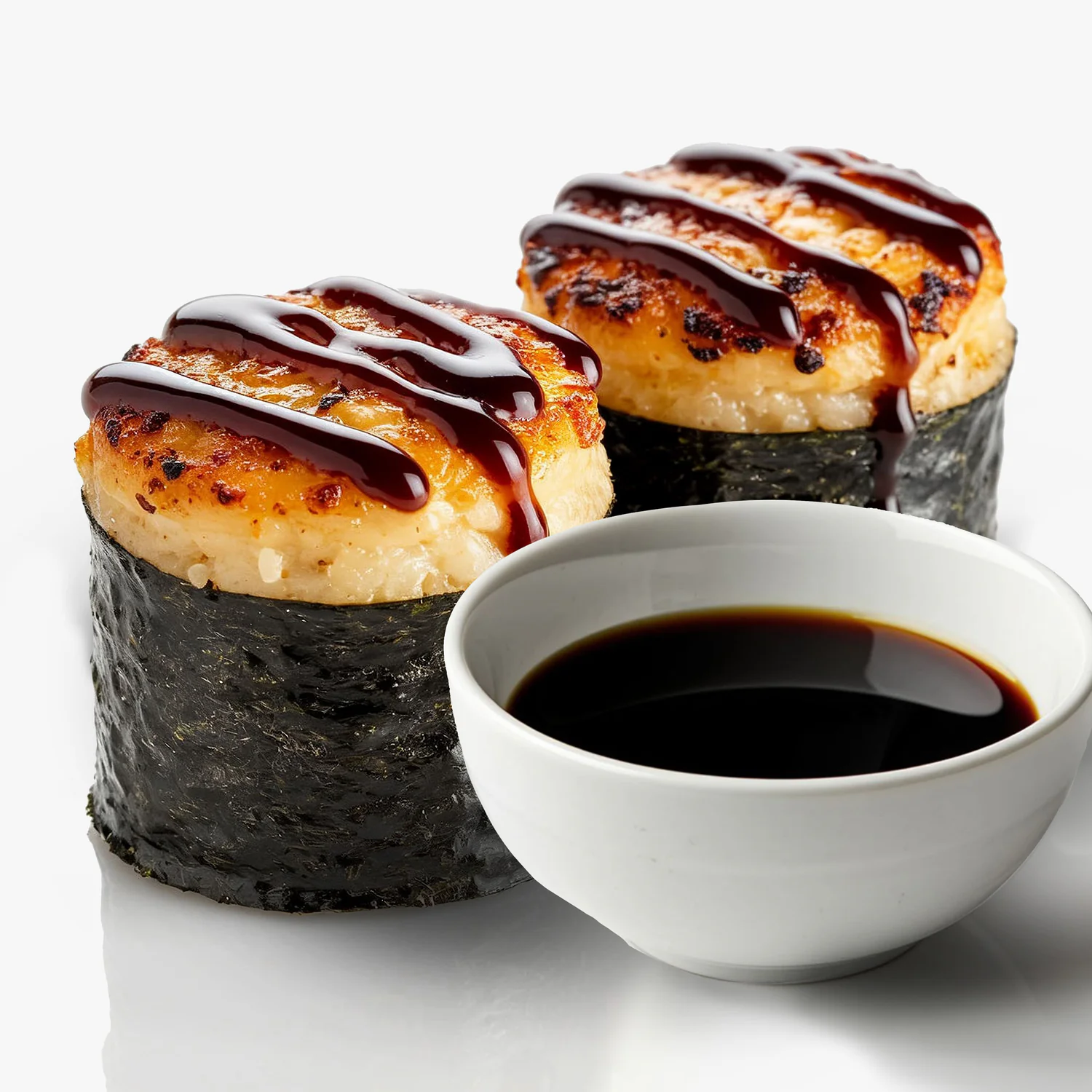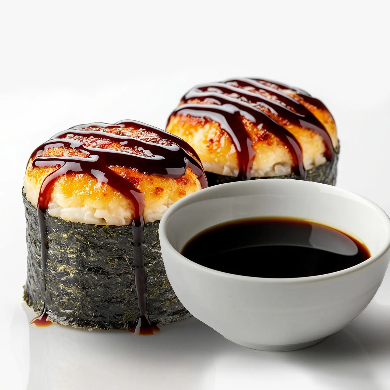 Запеченный ролл. Сыр творожный «Hochland», Масаго Чёрная, тонко нарезанный Лосось, Угорь, Майонез, Соус унаги. Состав включает в себя в том числе и шапочку ролла.