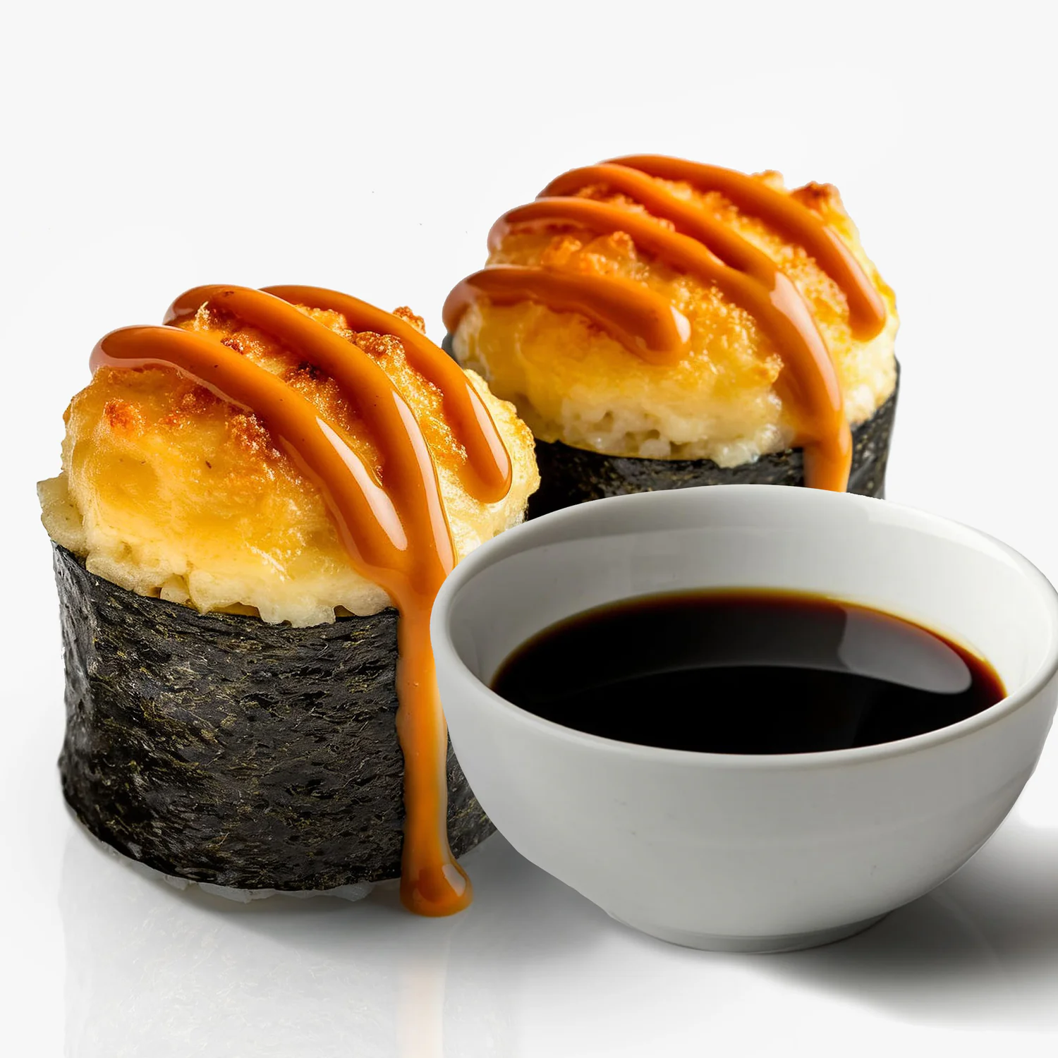 Запеченный ролл. Творожный сыр "Hochland", копченый тунец, креветки, соус спайс. Состав включает в себя в том числе и шапочку ролла. Ролл с остринкой.