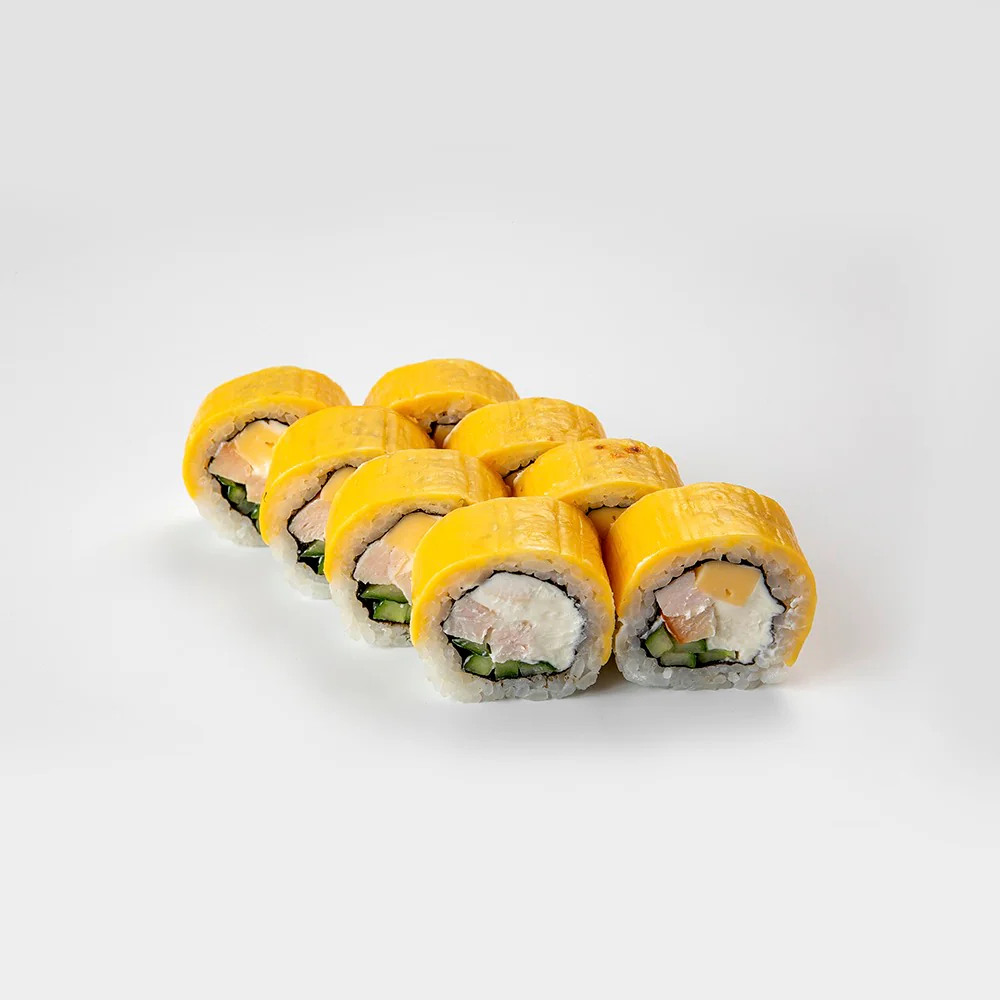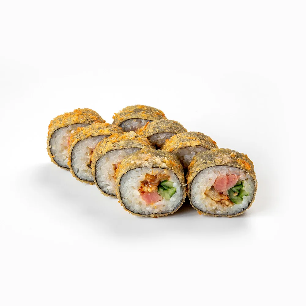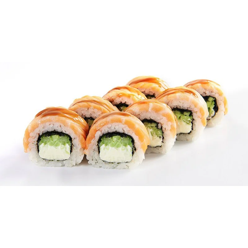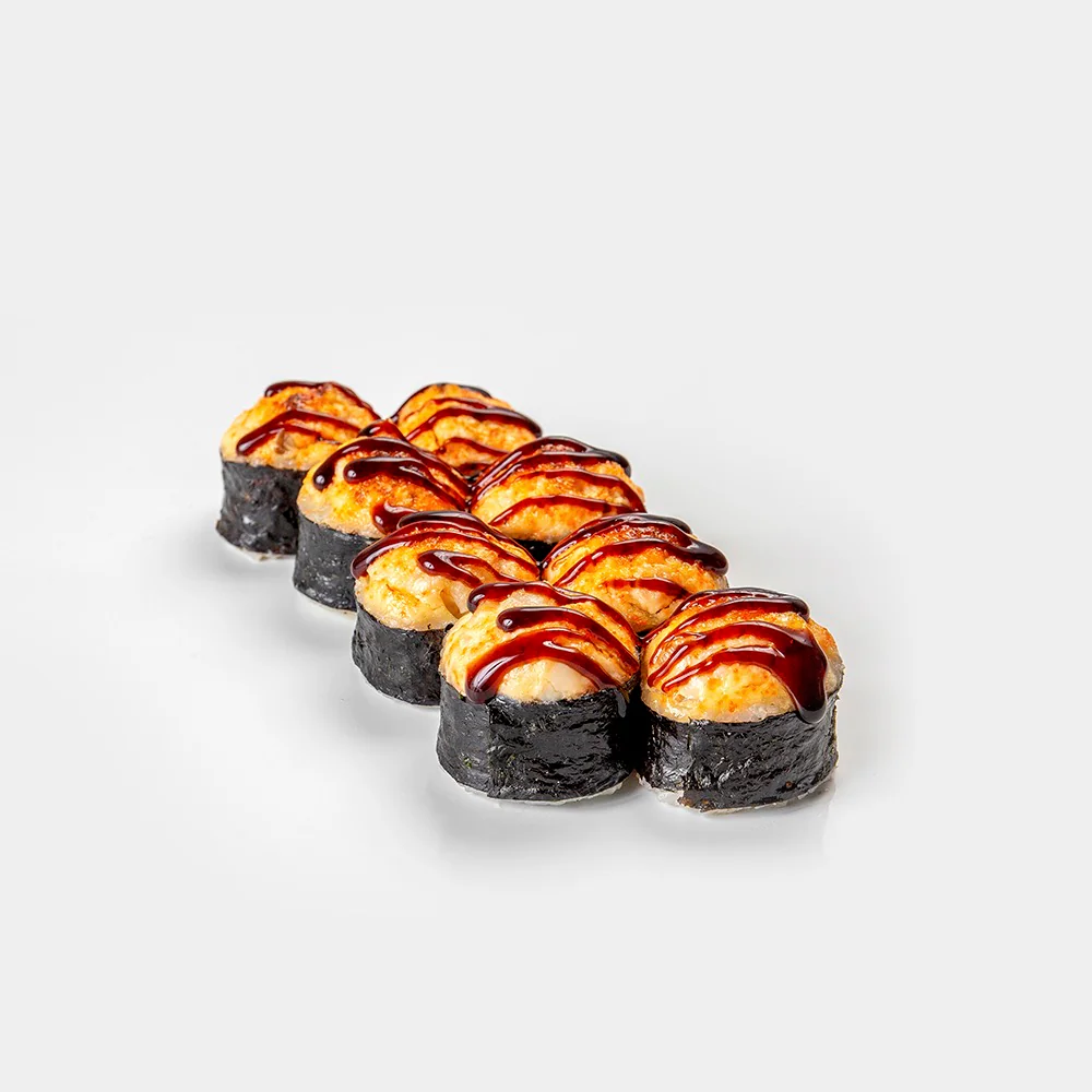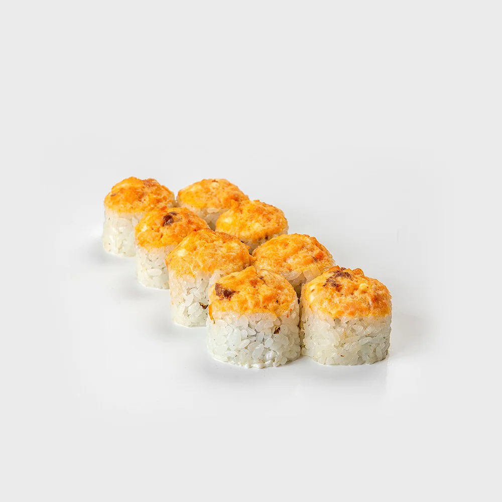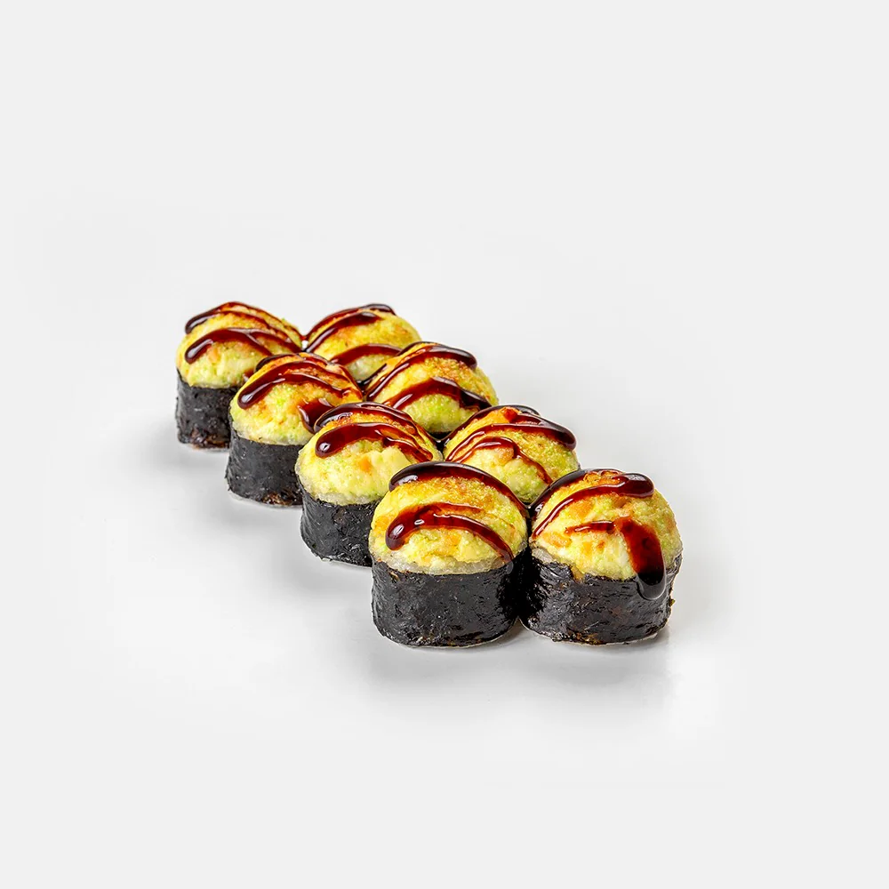 Запеченный ролл. Сливочный сыр, фирменный соус, Огурец, Креветка, Унаги, тонко нарезанный Лосось, сыр Чеддер. Состав включает в себя в том числе и шапочку ролла. Возможна небольшая острота в ролле.