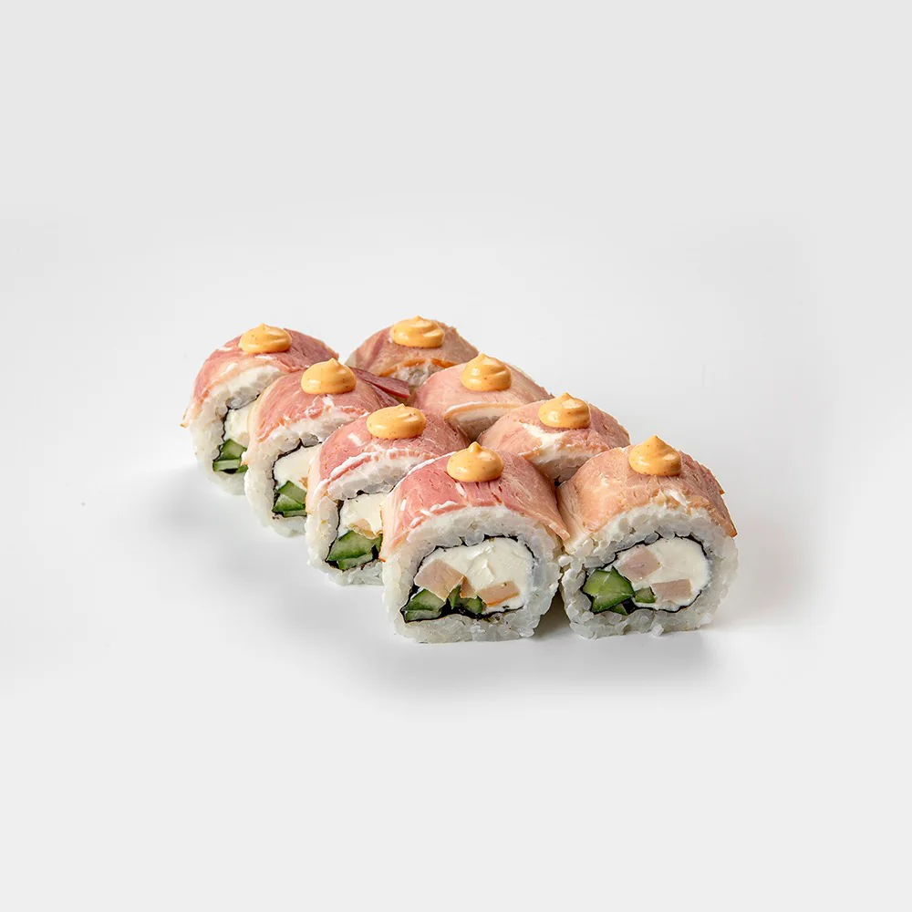 Творожный сыр "Hochland", копченый тунец, креветки, соус спайс. Состав включает в себя в том числе и шапочку ролла. Ролл с остринкой.