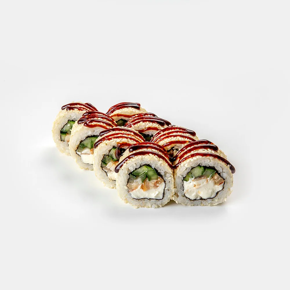 Запеченный ролл. Творожный сыр "Hochland", креветка, фирменный соус, соус унаги, кунжут. Состав включает в себя в том числе и шапочку ролла.