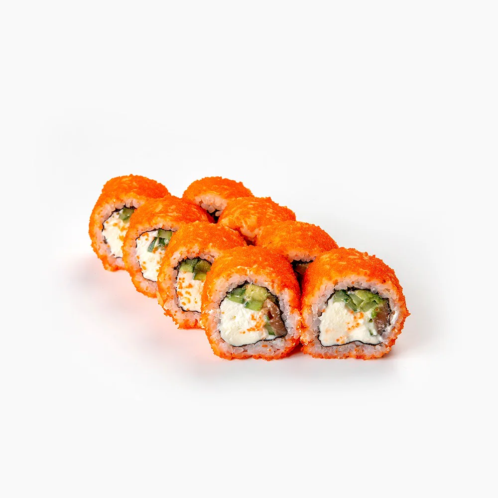 Угорь, тобико, дайкон маринованный, огурец, сливочный сыр