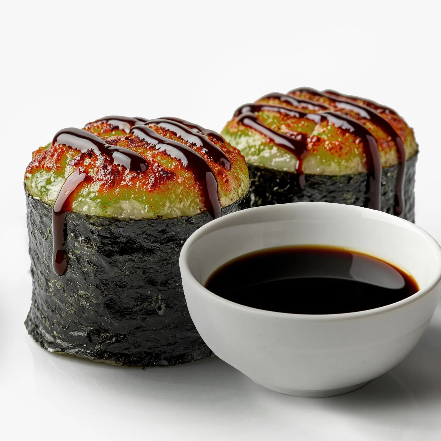 Запеченный ролл. Масаго Зеленая, тонко нарезанный Лосось, Креветка, Майонез, Соус унаги, сыр Чеддер, сыр творожный «Hochland». Состав включает в себя в том числе и шапочку ролла. В ролле присутствует небольшая острота.
