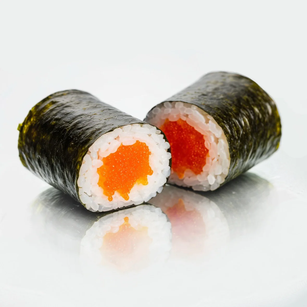 Мясо королевской креветки, тобико, дайкон маринованный, огурец, творожный сыр