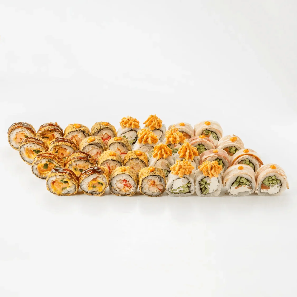 Сибо, Калифорния с крабом, Калифорния с лососем, Калифорния с угрём, Гесенай, Дракон, Цезарь, Акинава, Классический ролл с копчёной курицей, Классический ролл с беконом, Классический ролл с огурцом. Роллов - 11 Кусочков – 82 шт.