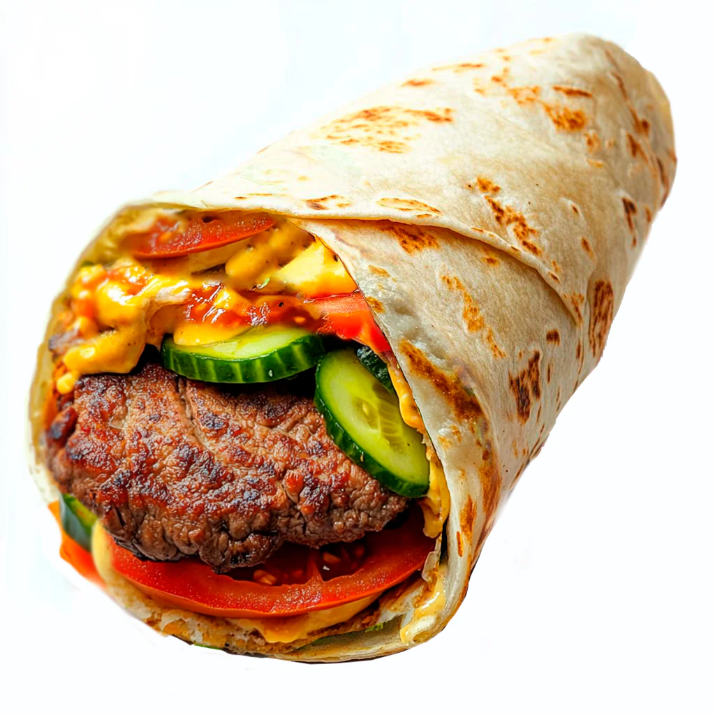 Две котлеты из говядины, сыр Чеддер(в растопленном виде), чипсы Начос, корейская морковь, помидор, перец халапеньо, лук красный, соус мексиканский, соус сырный
